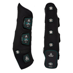 Ces guêtres thérapeutiques combinent magnétothérapie et soutien mécanique pour les membres antérieurs. Les aimants en néodyme génèrent une induction de 2 600 gauss chacun, optimisant la circulation sanguine et lymphatique. Elles assurent le maintien des ligaments suspenseurs et de l'appareil tendineux lors du transport et en récupération. Fabrication italienne.