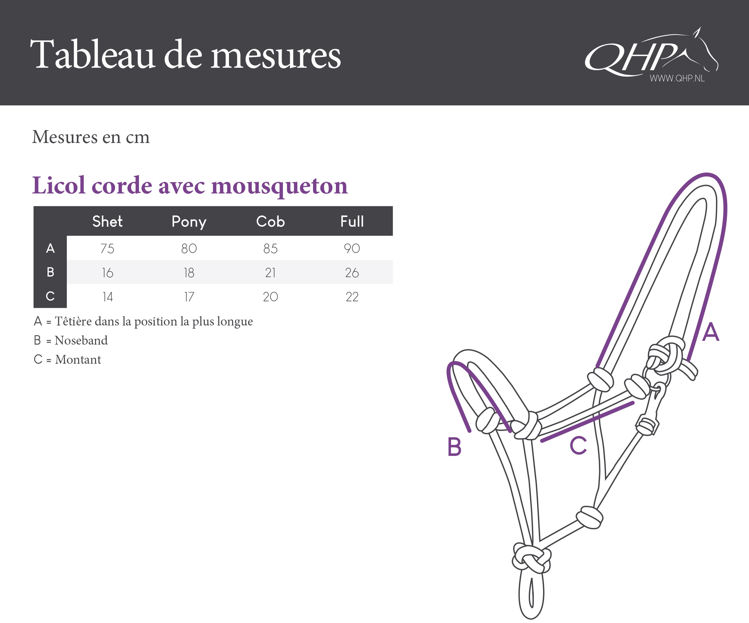 Licol corde avec mousqueton QHP avec une jolie muserolle bicolore et une fermeture à mousqueton.