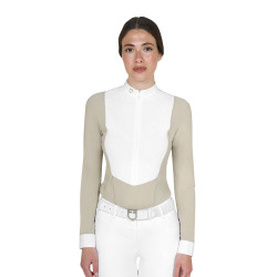 La fermeture à boutons cachés confère à ce polo un rendu sobre et épuré, conforme aux standards des concours d'équitation. Sa coupe slim fit épouse harmonieusement la silhouette féminine, avec un ajustement délicatement resserré à la taille. Le col en coton blanc contraste élégamment avec le corps du vêtement, tandis que le logo Equestro brodé sur le col apporte une touche de distinction.